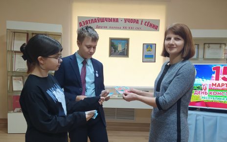 В рамках районной тематической трёхдневки «#Мы _за_процветающую Беларусь!» активом пионерской дружины гимназии № 1 г. Дятлово проведена ПРОМО-акция «БеларусиЯ». Акция была приурочена ко Дню Конституции Республики Беларусь и прошла среди сотрудников Дятловского историко-краеведческого музея. Юлия Леонидовна ВОЛЧКЕВИЧ, педагог организатор, г. Дятлово, гимназии № 1.