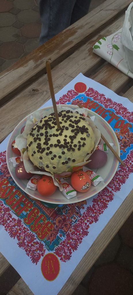 Вечером перед праздником, мы обязательно едем в церковь освятить наши куличи и яйца. Так получается, что каждый год погода выпадает теплая и солнечная, так что находиться там одно удовольствие.