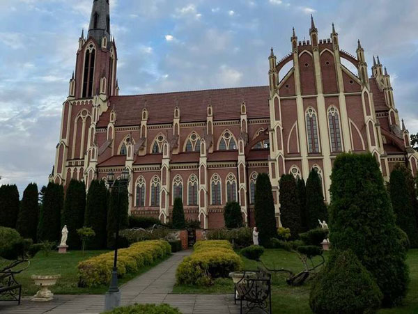 Когда мы подъезжали к Гервятам, уже издалека увидели высокие шпили, устремлённые в небо. Костёл выглядел словно сказочный замок, окружённый ухоженным парком с аккуратными дорожками и цветущими клумбами. Архитектура храма поражает своей лёгкостью и изяществом: ажурные башни, стрельчатые окна, каменные узоры — всё это делало его похожим на готический собор из средневековой Европы.