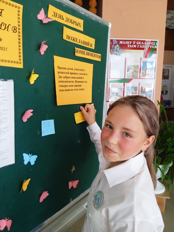 «Давайте говорить комплименты!» – девиз второго дня. Педагоги и школьники оставляли вежливые, добрые слова-пожелания коллегам или одноклассникам на стенде.