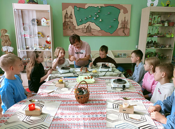 Маршрут привёл ребят в единственный в Беларуси Музей писанки при Сопоцкинском культурно-туристическом центре. Главная гордость музея – стенд с 95 традиционными сопоцкинскими писанками, созданными мастерами из Сопоцкина и окрестных деревень. Каждая деревня – со своим узором: в Марковцах – одуванчики, в Осташе – солнце и звёзды, в Головенчицах – замысловатый пояс. Эти символы передаются из поколения в поколение уже более ста лет.
