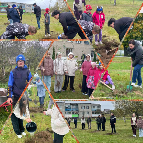 Дружна ўзяліся за работу настаўнікі, пачаткоўцы, вучні сярэдніх і старэйшых класаў: хтосьці капае ямы, хтосьці вывозіць глебу, малодшыя трымаюць дрэўцы, старэйшэя ўтрамбоўваюць зямлю вакол карэньчыкаў і паліваюць саджанцы. Кожнаму знайшлася справа па сілах!