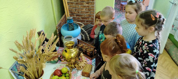 Юлия Викторовна показала ребятам, как выглядела типичная белорусская изба, рассказала о ее внутреннем убранстве. Это стало интересным открытием для детей — они увидели, чем пользовались люди на протяжении веков. В процессе экскурсии воспитанники познакомились с различными предметами, которые использовались в прошлом. Они увидели настенные коврики, печь, посуду и домашнюю утварь. Для детей было особенно интересно услышать, как с помощью этих вещей люди готовили еду, сохраняли тепло и заботились друг о друге. Также ребята смогли рассмотреть образцы белорусской традиционной одежды. Воспитатель объяснила, как она изготавливалась, какие ткани использовались, и какие мотивы были популярны. В конце экскурсии воспитатель провела интерактивную часть, где дети могли поиграть в старинные игры и исполнить белорусские заклички. Это создало атмосферу веселья и способствовало закреплению полученных знаний.