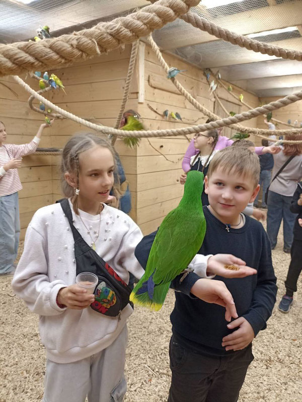 Ребята познакомились с десятками экзотических птиц. В попугайне царила уютная и комфортная атмосфера. Школьники гладили и кормили попугаев. Попав в весёлую компанию пернатых, ребята получили массу удовольствия и незабываемый опыт общения.