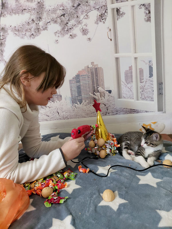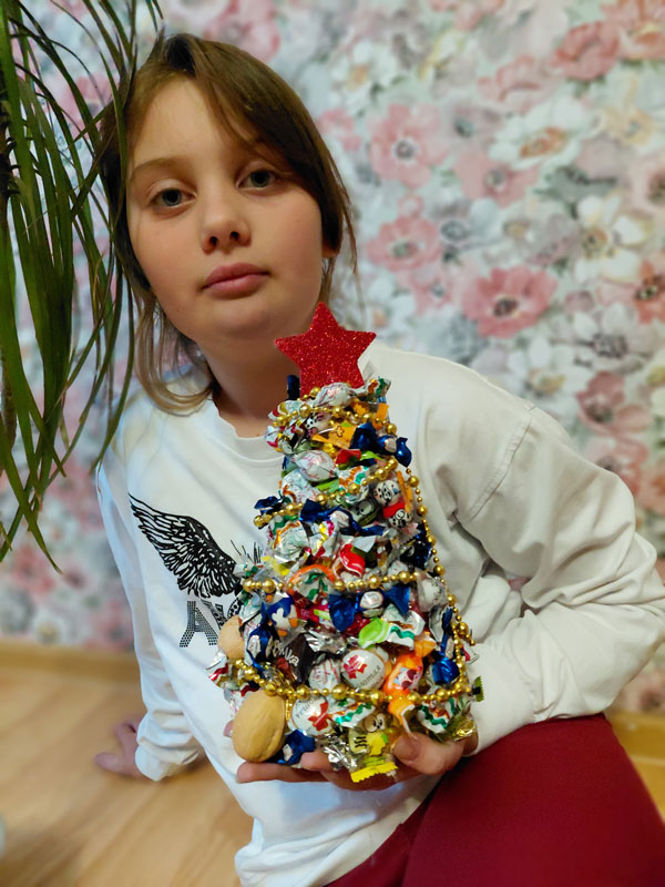 Теперь самое весёлое: берём побольше конфет, больших и маленьких, и начинаем приклеивать их на ёлку снизу вверх с помощью термоклея. Я ещё добавила грецкие орехи и бусы.