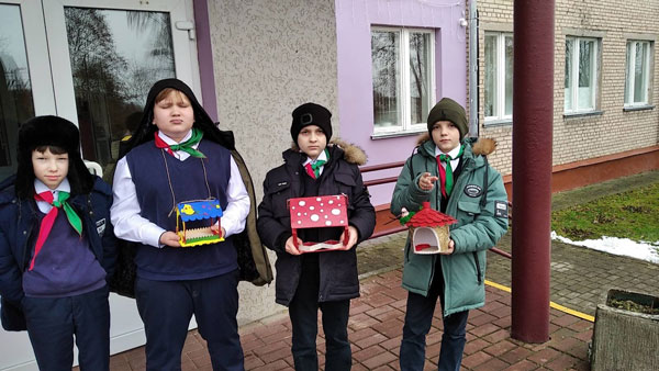 Тимуровцы школы объединились, чтобы изготовить кормушки, им помогли также родители. Каждый внёс свою лепту, и в итоге было создано множество уникальных птичьих столовых из древесины, фанеры, бросовых ДСП, ДВП-материалов, пластиковых панелей. Пионеры-активисты помогли развесить их во дворе школы, засыпать семечки, семена растений, крупы. Ежедневно девчонки и мальчишки будут следить за тем, чтобы в кормушках всегда был корм.