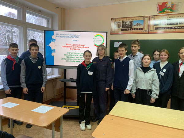 Вместе с классным руководителем 8-го класса Галиной Илларионовной Хомянок учащиеся рассмотрели такую тему, как «Быть достойным гражданином Республики Беларусь – значит грамотно пользоваться своими правами, честно и добросовестно исполнять свои обязанности». Спикером выступила старший инспектор ИДН Россонского РОВД Екатерина Николаевна Юхневичус.