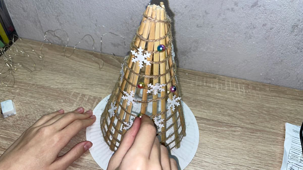 - Теперь самое интересное: украшаем ёлку вырезанными из бумаги снежинками и разноцветными бусинами. Оставшиеся края тарелки закрываем ватой, имитируя снег. На вершину ёлки приклеиваем бантик или любое другое украшение. Готовую ёлку по желанию можно обвить ниточкой светодиодной гирлянды.