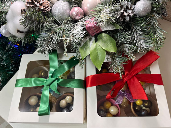 - Берём чашечки, заполняем орехами и сухофруктами. Ставим чашечки в подарочную коробку. Добавляем орешки.
