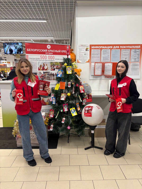 Я тоже являюсь волонтёром Белорусского Красного Креста. Сюда приходят люди по зову своего сердца, чтобы делать добрые поступки. Белорусский Красный Крест проводит благотворительную акцию «Ёлка желаний». Волонтёры привлекают внимание людей в торговых центрах, рассказывают о способах поддержки нуждающихся, раздают информационные буклеты. На этот раз к новогодней кампании Красного Креста присоединилось множество учащихся города Витебска.