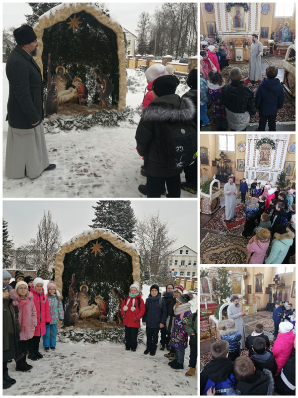 Настоятель храма протоиерей отец Александр Сень с великой радостью встретил нас у ворот. И сразу же у вертепа начал свой интересный рассказ о празднике Рождества Христова. Затем мы прошли в храм, где и продолжилось общение со священником. Отец Александр интересно и доступно для нас рассказывал Рождественские истории, а убранство храма помогло «перенестись в Рождественскую сказку». Мы были внимательными слушателями, в итоге правильно и дружно ответили на все вопросы викторины, которые предложил отец Александр.