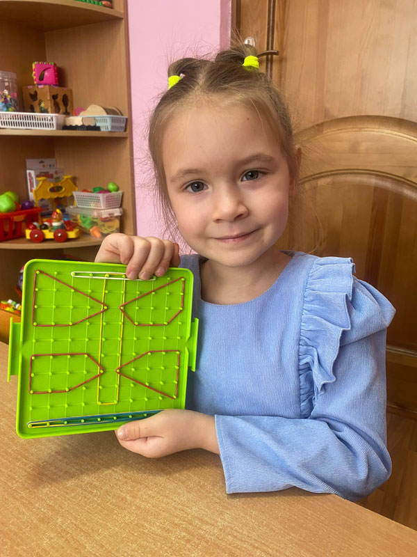 Развитие моторики – одна из важнейших задач при обучении ребёнка. С помощью геоборда развиваем сенсорную координацию, моторную память и готовим руку к письму. Занятия с геобордом стимулируют мыслительную деятельность, формируют причинно-следственные связи, а также помогают ребенку в изучении геометрических фигур и счета. Помогают дошкольникам развить усидчивость, расширить представление об окружающем мире. Геоборд помогает придумать свои истории и сюжеты для игры, а также развить воображение.
