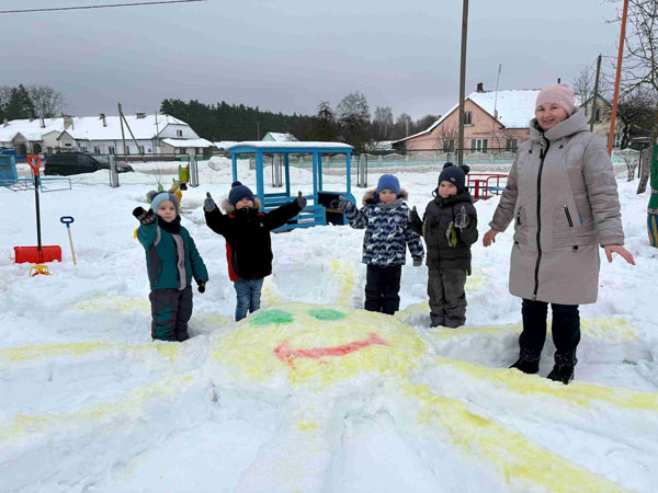 Ребята разгребали снег на участке, катали снежные комы и лепили снеговиков. Такие постройки не только украшают участки, но и делают зимние прогулки более интересными и запоминающимися для детей. Рисование на снегу – это и творчество, и познание ребёнком окружающего мира, в ходе которого он проявляет фантазию и полуает удовольствие от процесса!