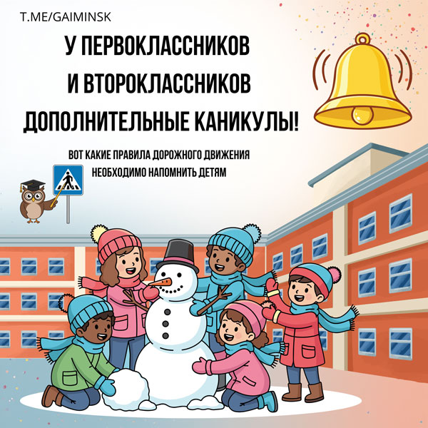 Столичная Госавтоинспекция обращает внимание участников дорожного движения на то, что с 16 по 22 февраля у перво- и второклассников проходят дополнительные каникулы.