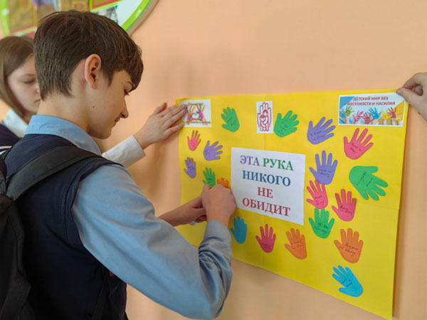 Акция помогла создать в учреждении атмосферу дружбы и взаимопонимания: учащиеся писали на ладошке обещание «Никого не обижу» и вместе создавали арт-объект против насилия.
