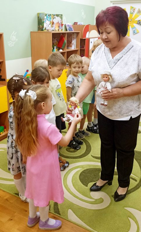 Дзень у дзіцячым садзе пачаўся з ранішняй гутаркі «Нашыя знакамітыя беларускія песняры». Выхаванцам распавялі пра творчасць беларускіх паэтаў Янкі Купалы і Якуба Коласа ў суправаджэнні прэзентацыі. Госцем гасцёўні былі лялькі Янка і Арынка, якія загадалі дзецям беларускія загадкі.