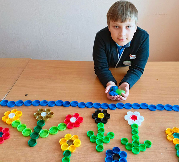 Участвую в школьной экологической акции «Добрые крышечки» по сбору пластиковых крышек. Создал из них весеннюю композицию. Более 100 крышечек – и картина готова! А вы знали, что крышки сортируют отдельно?