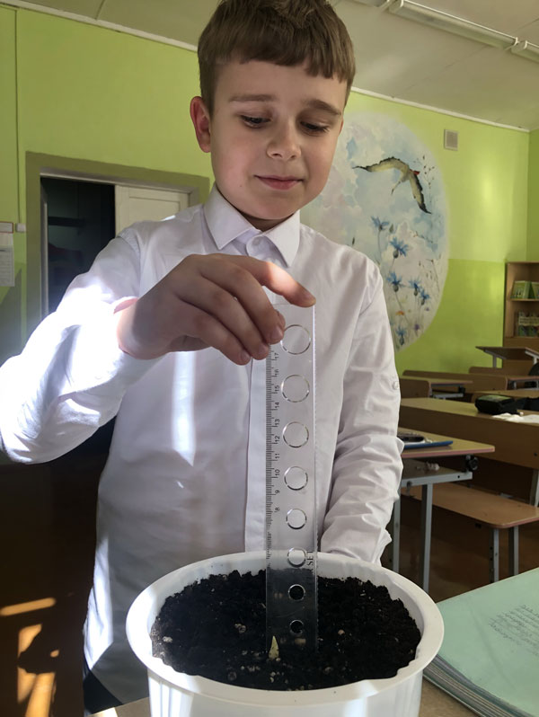Каждый день бегал к подоконнику и смотрел: ну, когда? И вот 16 марта – ура! – показался первый зелёный росточек! Он был всего 9 миллиметров, но какой же он был красивый! Я был счастлив!