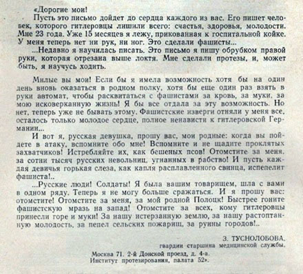 Зинаида Михайловна Туснолобова-Марченко – Герой Советского Союза. Её имя стоит особняком даже среди тысяч героинь. Она была санинструктором. Первую боевую награду – Красную Звезду – Зина получила по итогам первых же сражений летом 1942 года. За свою недолгую боевую жизнь – только 8 месяцев довелось ей провести на передовой – Зинаида Туснолобова спасла 123 жизни. За три дня боев под Курском в феврале 1943 года 23-х летняя девушка вынесла с поля боя 40 раненых бойцов. Когда командир был ранен, она подняла роту в атаку. В бою её тяжело ранило (перебило ноги), и она четыре дня ползла по снегу к своим, обмораживая руки и ноги. В результате обморожения и гангрены она лишилась обеих рук и обеих ног. Но она не сломалась, научилась писать заново (держа ручку в зубах, затем в культе руки) и вела активную переписку с фронтовиками. Её легендарное письмо «Дорогой мой, далёкий друг!» было опубликовано в армейских газетах. Оно призывало бойцов мстить за неё и за всех искалеченных войной. Это письмо стало одним из самых сильных документов эпохи. Солдаты носили его в нагрудных карманах. Одно из нескольких писем Зинаиды Туснолобовой-Марченко, которое было опубликовано в газете «Вперед на врага» 13 мая 1944 года, было обращено к бойцам 1-го Прибалтийского фронта. В нём она, потерявшая на фронте руки и ноги, призывала воинов отомстить за неё и за её родной Полоцк. Это обращение вызвало огромный отклик: на танках, самолетах и орудиях по всему фронту появилась надпись: «За Зину Туснолобову!». В 1957 году ей было присвоено звание Героя Советского Союза. Но самый уникальный случай произошёл в 1965 году: Канадский легион (ветераны союзных войск) лишил британского фельдмаршала Монтгомери звания «Почётный легионер» и передал это звание Зинаиде Туснолобовой-Марченко. Это был беспрецедентный случай международного признания её личного мужества.