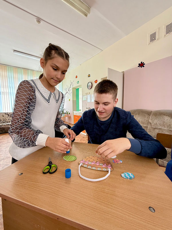 Ребята вместе творили маленькую магию – мастерили пасхальные корзинки. Детские ладошки бережно перебирали веточки, завязывали яркие ленточки, вкладывали в плетение весенние цветы. Кто-то поправлял неуверенный узелок, кто-то тихонько подсказывал, а кто-то просто смотрел с улыбкой – и этой искренней улыбки хватало, чтобы каждая корзинка стала уникальной, наполненной теплом человеческих рук. А потом все собрались за одним большим столом. Достали кулич – румяный, щедрый, пахнущий ванилью, домом и самим теплом. Отламывали по кусочку, бережно передавали друг другу, и в тишине звучало главное слово праздника: «Христос воскресе!». «Воистину воскресе!» – отвечали глаза, в которых вспыхивали радостные огоньки. В эти мгновения растворились все невидимые границы. Стало не важно, кто откуда, кто что может или не может. Важно было лишь одно – мы вместе. Мы делим эту радость. Мы делим эту Святую Пасху. И кусочек того самого, настоящего добра, замешанного на любви и милосердии, остается в каждом сердце. Не на час. Надолго. А может, и навсегда, чтобы светить даже в самые пасмурные дни.