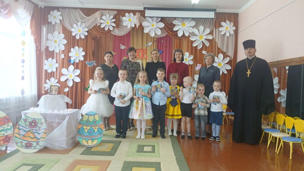 В разновозрастной группе ребята вместе с воспитателями сделали стенд «Панорама добрых дел», оформили выставку «Пасхальное чудо». Дошкольники пели песни, читали стихи, прославляли воскресшего Иисуса Христа, показали сказку про Зайчика, который всё делал по-своему, но в конце сказки, понял, что ко всем относится надо так, как ты хочешь, чтобы относились к тебе. Воспитанники поиграли в игры «Перенеси яйцо», «Катание яиц», отгадали пасхальные загадки.