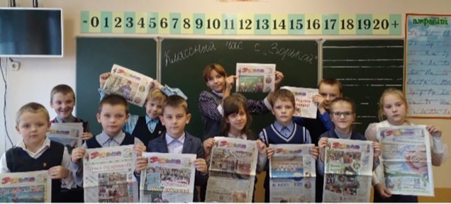 На информационном часу «Газета «Зорька» – газета для детей» учащиеся 3-го класса Клястицкой детский сад–средней школа имени В. А. Хомченовского подробно познакомились с рубриками, содержанием газеты, а также с её историей.