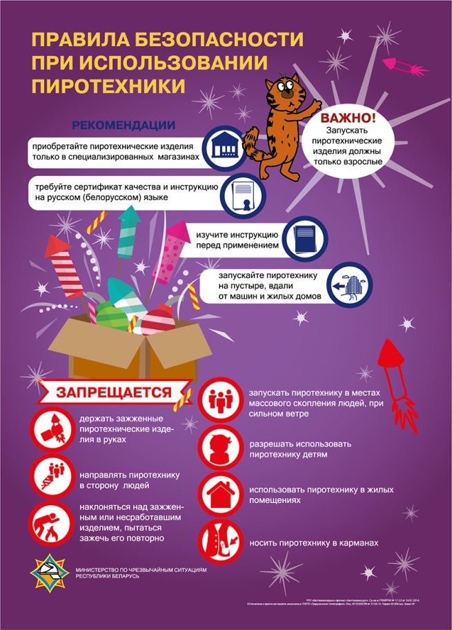 – не покупайте пиротехнику с рук (вы не можете быть уверены в качестве ее изготовления и условий хранения), не разрешайте пользоваться ей детям до 18 лет, соблюдайте все требования инструкции по эксплуатации (обратите внимание на то, что для каждого изделия она будет отличаться);