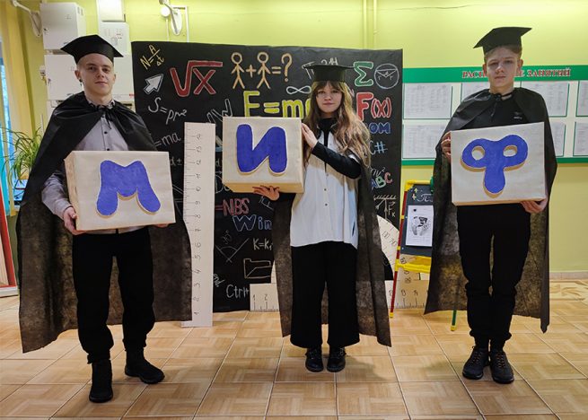 Утро. Педагоги и учащиеся спешат в родную школу. Что ждёт их сегодня? Какие интересные встречи и новые открытия? Распахивается школьная дверь – и перед глазами большая чёрная грифельная доска с различными чертежами, математическими и физическими формулами. Кругом геометрические фигуры, транспортиры, измерительные линейки в человеческий рост… И среди всего этого многообразия встречают мальчишек и девчонок настоящие «магистры» точных наук… Так необычно началась в новогрудской школе № 4 неделя предметов физико-математического цикла «МИФ».