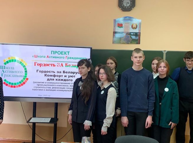 Вместе с классным руководителем 9 класса Ольгой Владимировной Малашенко учащиеся рассмотрели такую тему, как «Гордость за Беларусь. Комфорт и уют для каждого» (развитие и совершенствование строительно-промышленного комплекса, жилищного строительства, реализация государственной политики в жилищно-коммунальном хозяйстве).