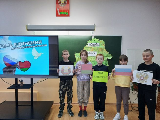 Школьники листали страницы необычной «книги», авторами которой являются два славянских народа – белорусский и русский. На странице «Символы государства» определили отличительные черты герба и флага Беларуси и России. Страница «Язык родной, дружи со мной» показала обучающимся, что русский и белорусский языки очень похожи. Перелистывая страницу «Наши традиции», школьники определили общие праздники у народов Беларуси и России, которые отмечают в один день: Новый год, День защитников Отечества, День женщин, День Победы, Праздник труда, День знаний. Особая страница в истории наших государств – Великая Отечественная война 1941–1945 гг. В заключение мероприятия ребята высказали пожелания ровесникам России.