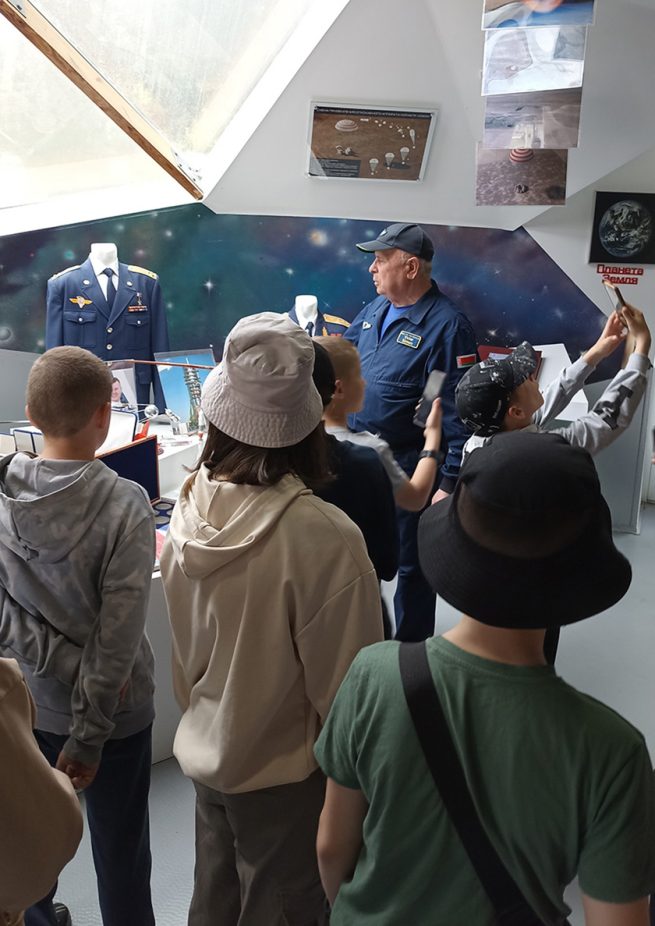 Александр Викторович Симон, начальник музея, встретил нас с ребятами на территории музея авиационной техники и рассказал об истории создания музея, об экспонатах музея, о подвигах белорусских космонавтов, которыми гордится наша страна. В павильоне «Космос», который находится в центре музея ребята смогли потрогать скафандр, увидеть космический обед и многое другое.