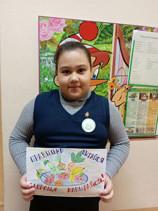 Октябрёнок дружины имени Лизы Чайкиной Сабина Галияд, ученица 3-го класса – активная участница всех конкурсов рисунков. Сабина уверена, что правильное питание является залогом здоровья. Здоровое питание может быть вкусным и доступным. Свой рисунок назвала «Правильно питайся – здоровья набирайся!».